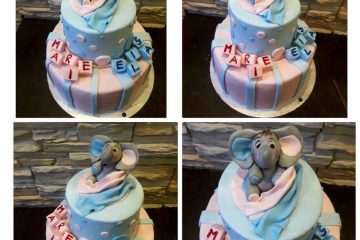Tauftorte in rosa und blau für eine Zwillingstaufe. Bauklötze mit Namen des jeweiligen Täuflings und ein handmodellierter Elefant machen diese Torte zu etwas Besonderem